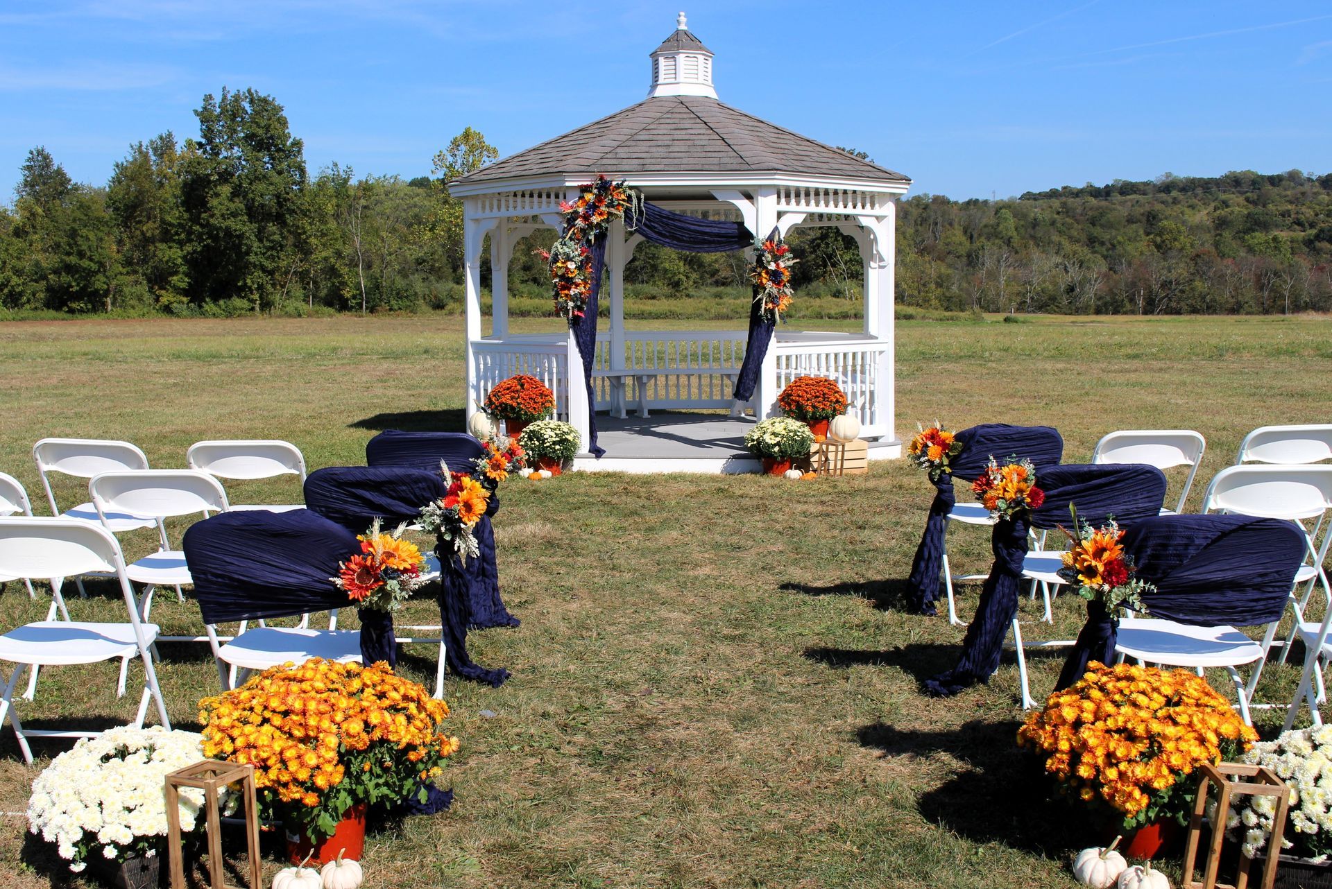 Our Pavillion, offering stunning views of the grounds, can accommodate up to 100 guests and features picnic tables and a private bar.